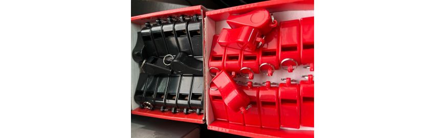 Fluier din plastic cu bila, de putere medie.Culori: rosu albastru si negru.Nu contine snur.