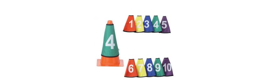 Set 10 huse cu numere pentru conuri (jaloane) de 30 cm, 35 cm sau 40 cm, utile pentru un antrenament profesional.Inaltime: 23 cm.Latime baza superioara: 6.50 cm; latime baza inferioara: 18 cm.Material: poliester.Se poate folosi exterior/interior.Excelente si pentru alte activitati sportive, la care se folosesc conuri.