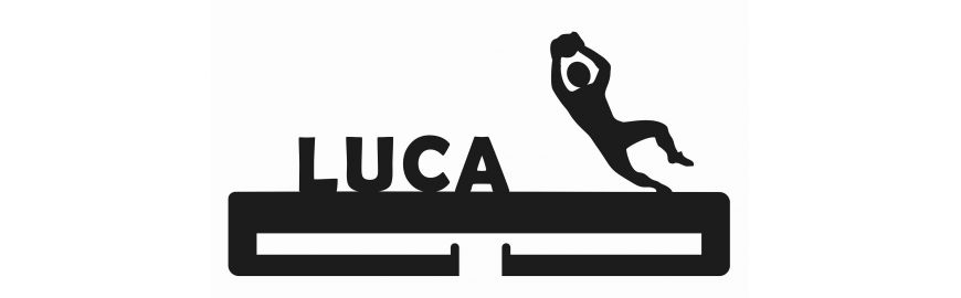 Suport medalii pentru perete si figurina portar, prevazut cu doua brate pentru expunere medalii.Realizat din plexiglas negru.Dimensiuni 400 mm x 170 mm.Prevazut cu doua agatatori acrilice, la spate, lipite pe latura de sus, sub literele decupate.2 holzsuruburi si 2 dibluri pentru prindere – incluse.