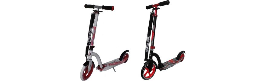 Trotineta Jumbo II 230×180 mm, comercializata de ART SPORT TOTAL, cadru fabricat din aliaj de aluminiu.Sistem de pliere brevetat.Ghidon reglabil pe inaltime: 82.5-105 cm.Punte aluminiu: 58×15 cm.Roata din fata: 230×33 mm.Roata din spate: 180×30 mm.Rulmenti: ABEC 7.Manere acoperite cu spuma moale.Greutate maxima utilizator: 100 kg.Certificare EN 14619.Greutate: 4 kg.Recomandata pentru adolescenti si adulti.Variante de culori:Cod SP229201: alb-roz.Cod SP229202: negru-rosu.